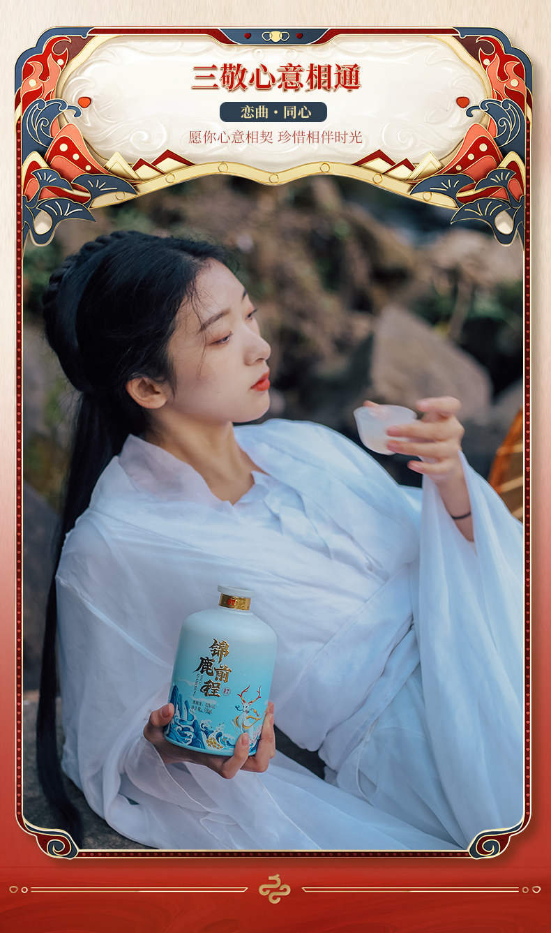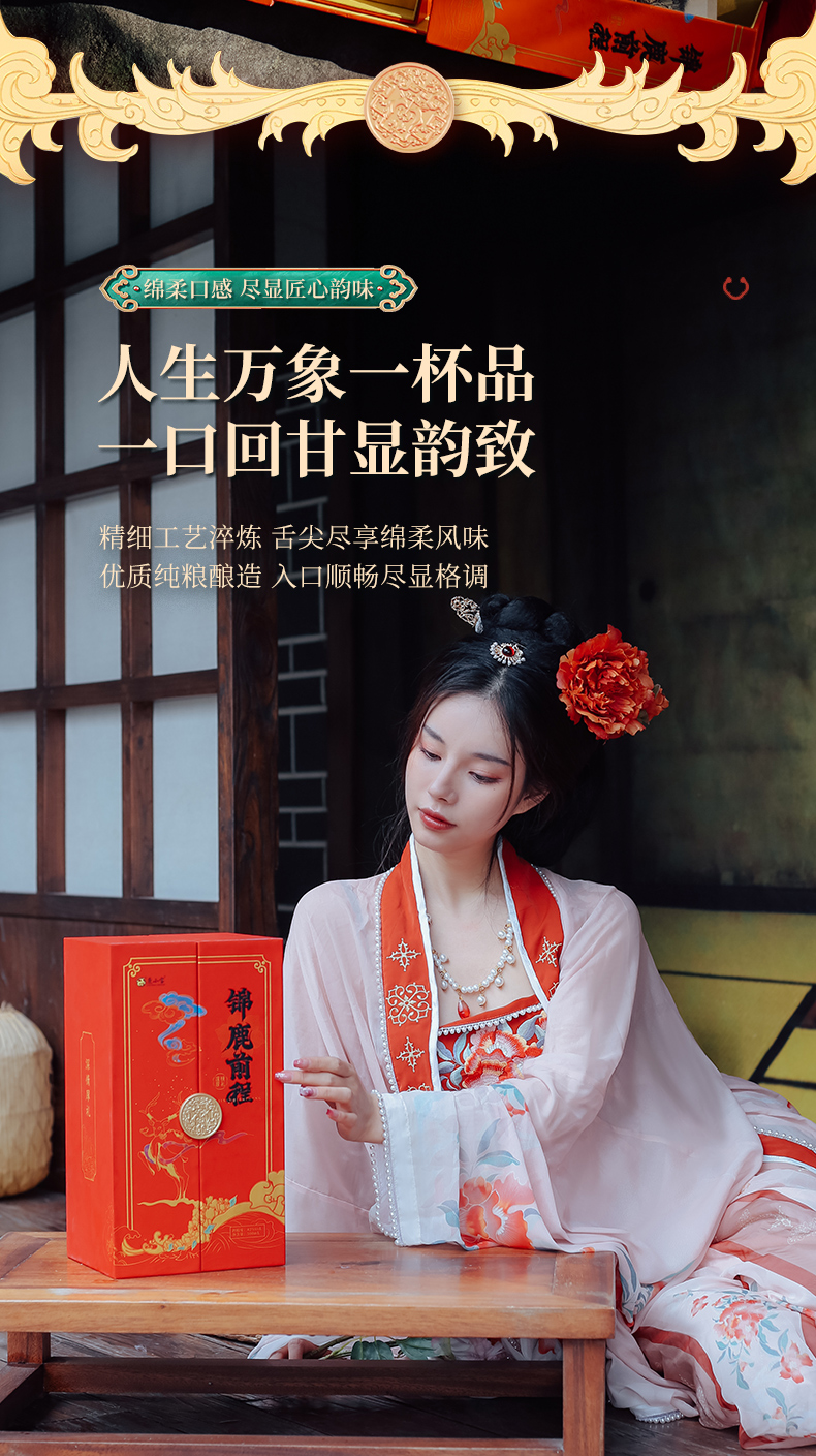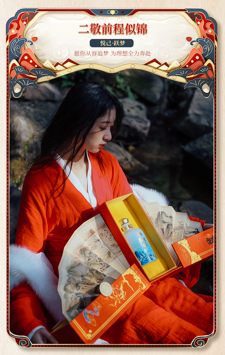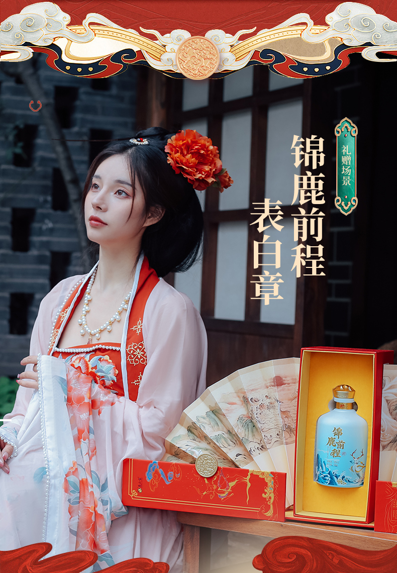 此产品为锦鹿前程系列,独特扇形装饰品饮更有仪式感,寓意大展鸿图、圆满吉祥.锦鹿前程豪礼传奇,瓶身精致山水插画彰显前途不可限量.礼盒烫金圆扣,赠礼高档尊贵.红色喜庆装饰适合欢聚时令,您值得拥有.