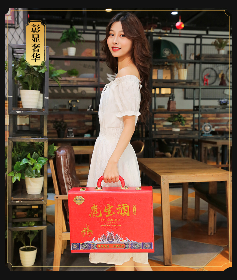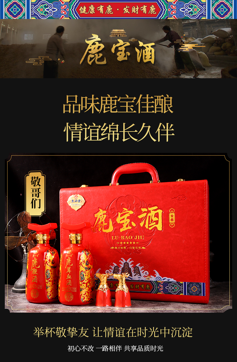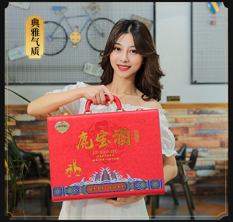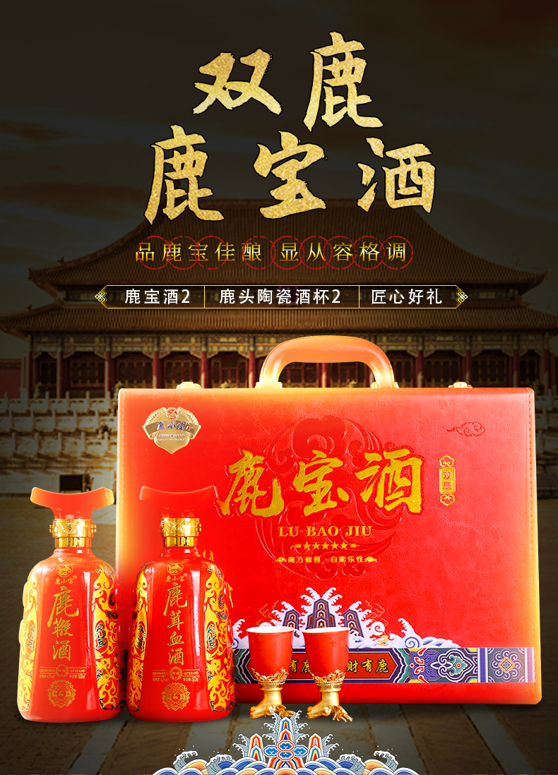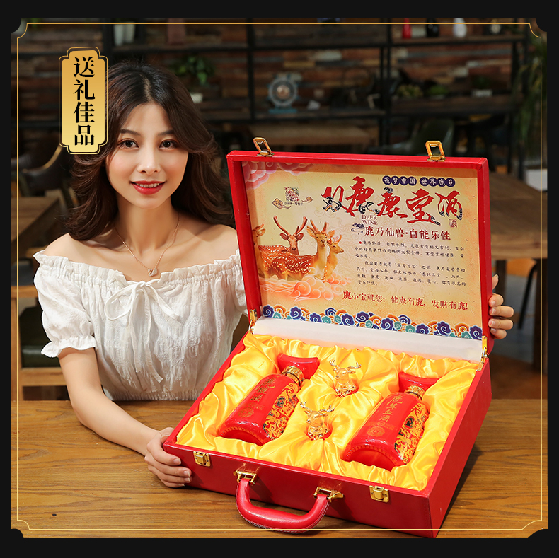 此产品为双瓶鹿宝酒,由鹿鞭酒x1,鹿茸血酒x1,包装选用中国红皮质材质,配置一对鹿头酒杯,整体视觉更加精美.