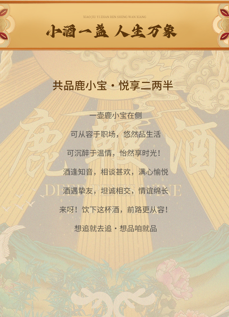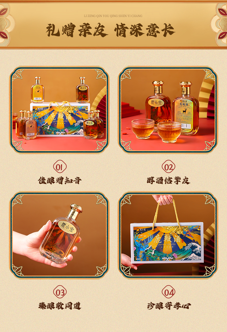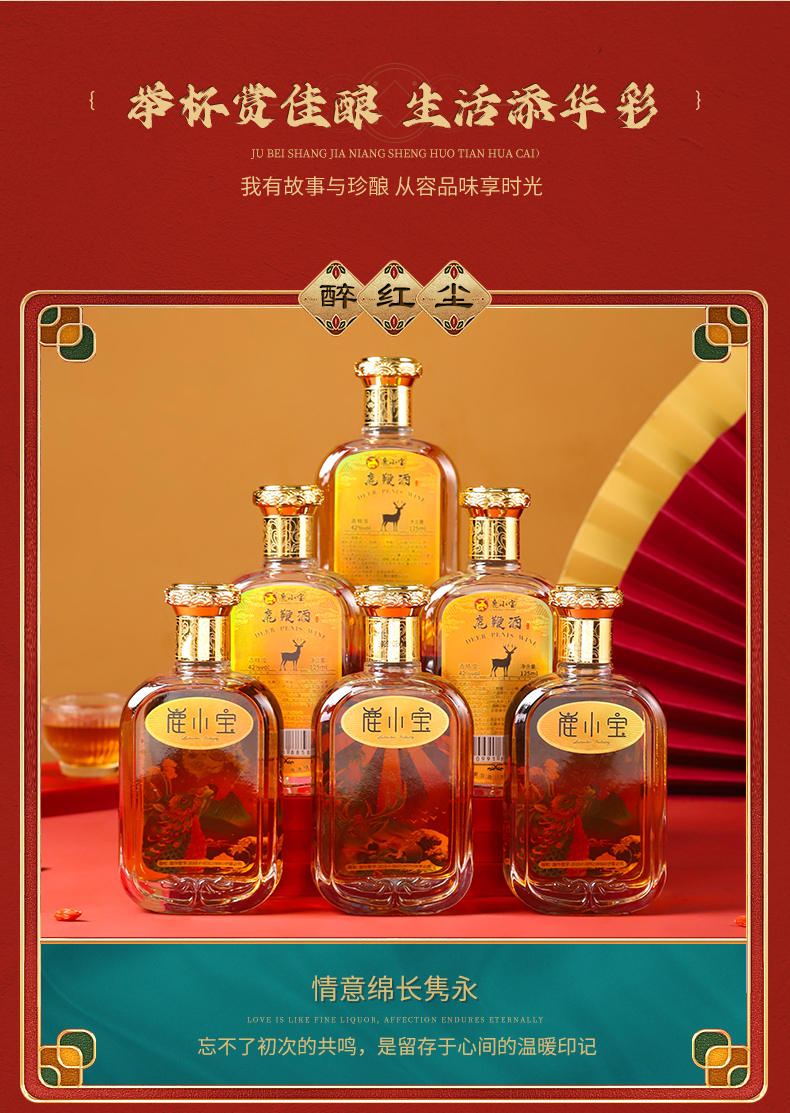 此产品由125ml鹿鞭酒x6瓶,另选用精美特色瓶身,新型背透瓶标设计,包装选用国风插画风格,显得更加精美大气.