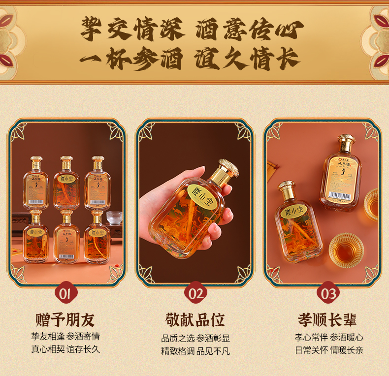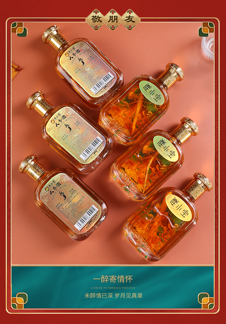 此产品由125ml人参酒x6瓶,另选用精美特色瓶身,新型背透瓶标设计,包装选用国风插画风格,每瓶带有一颗人参,显得更加精美大气.