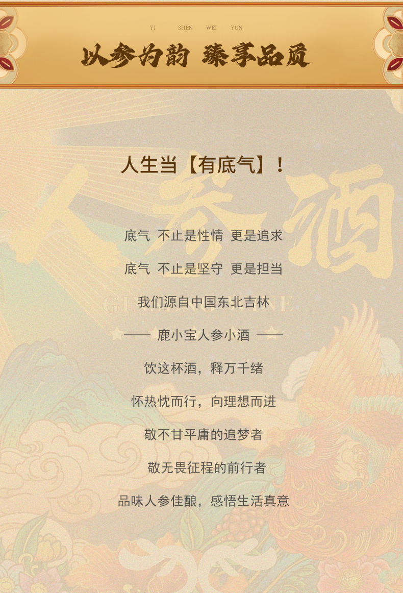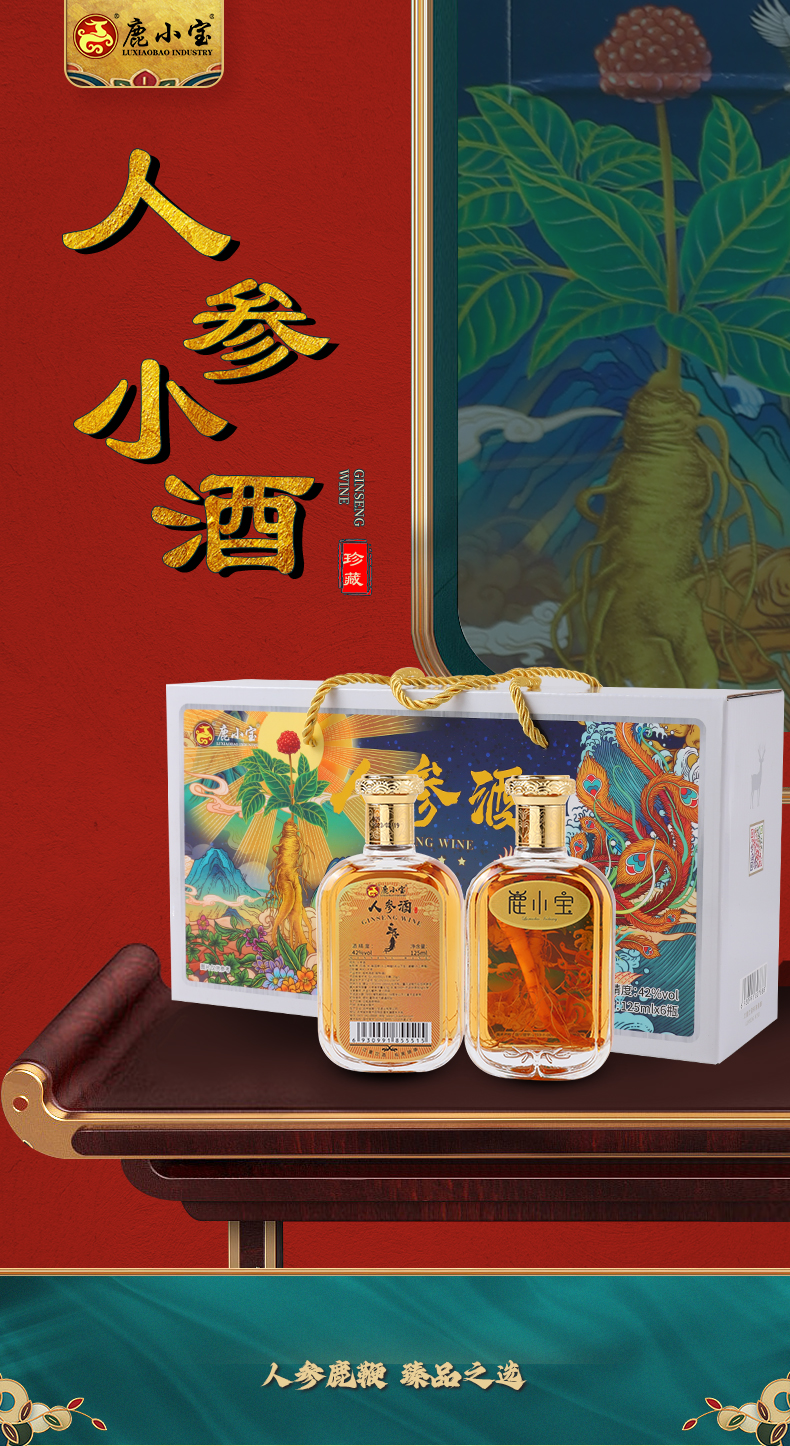 此产品由125ml人参酒x6瓶,另选用精美特色瓶身,新型背透瓶标设计,包装选用国风插画风格,每瓶带有一颗人参,显得更加精美大气.
